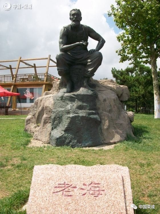 在一條10多米長的石質(zhì)座基上,7名年齡不一的漁家壯漢向前傾斜著身子奮力地拖著繩子。他們雙目圓睜,似乎用盡了全身力氣,張大的嘴巴中仿佛正在喊出渾厚有力的漁家號(hào)子。栩栩如生的雕塑,生動(dòng)地再現(xiàn)了榮成漁民的生活。